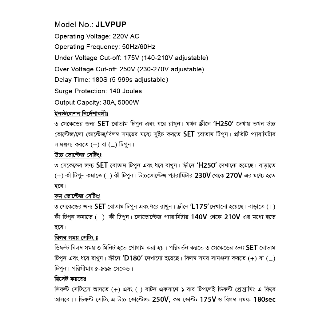✅ ওভার ভোল্টেজ কাট-অফ: 250V (230-270V অ্যাডজাস্টেবল)